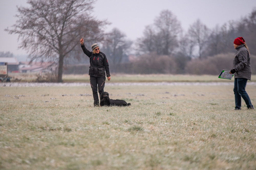 In der Unterordnung zeigt Hedda dann, was sie kann. Das Fußgehen ist super, die technischen Übungen werden mit starker Führerhilfe, aber dennoch präzise ausgeführt. Besonders stolz bin ich auf das Apportieren, das sie ganz toll macht. Auch beim Voraus zeigt sie eine beeindruckende Entwicklung: Sie löst sich schnell und druckvoll und läuft temporeich raus. Das Kommando „Platz“ nimmt sie sofort an, legt sich jedoch nicht vollständig hin, sondern verharrt in Lauerstellung. Das erfordert ein Doppelkommando und kostet uns wertvolle Punkte.