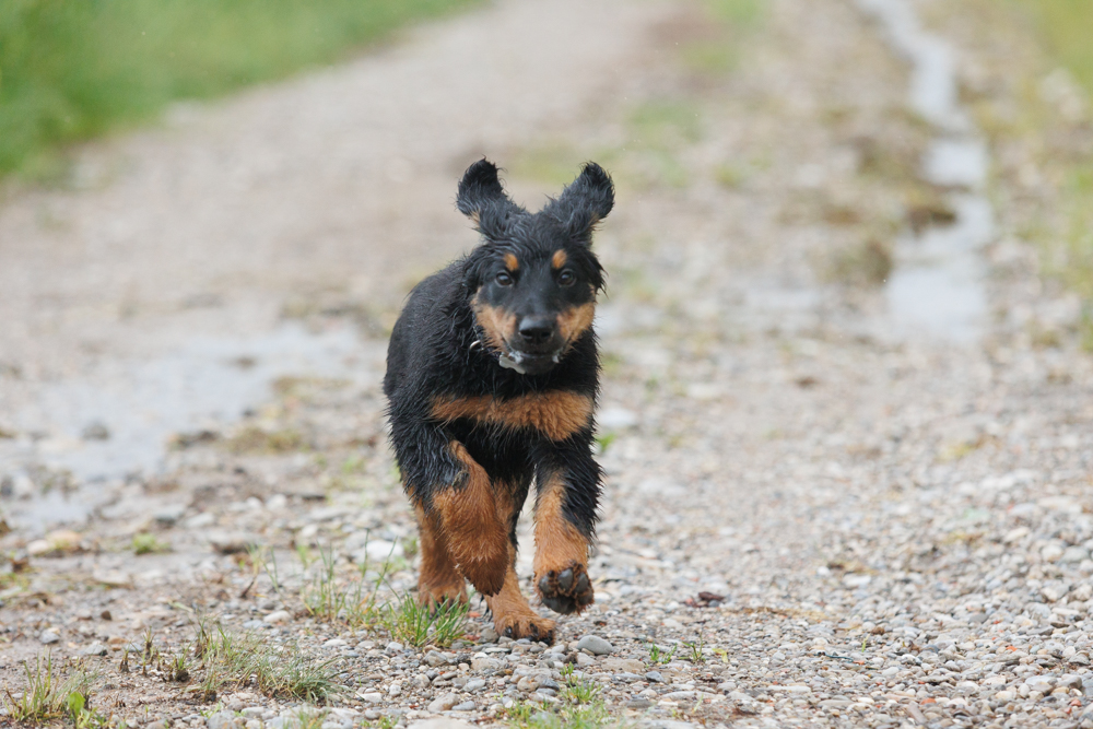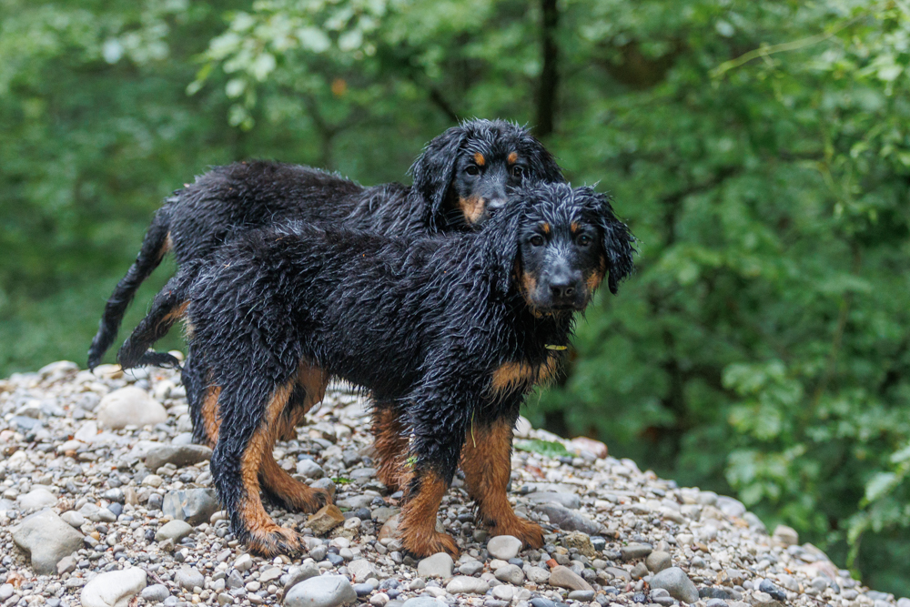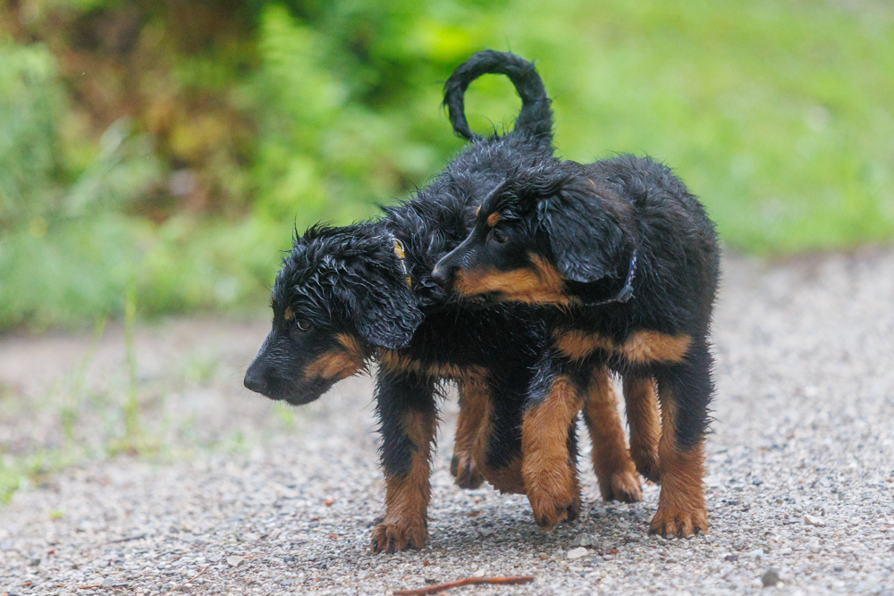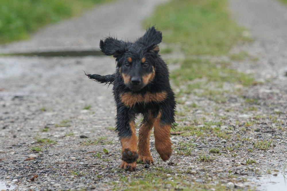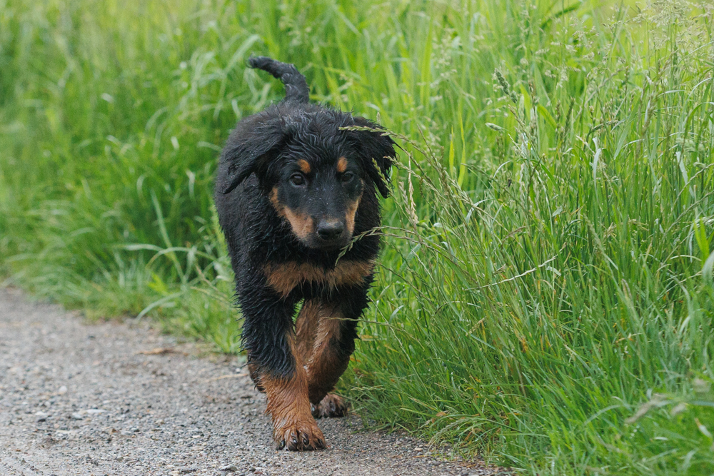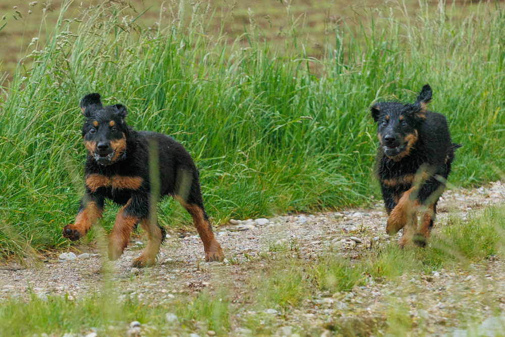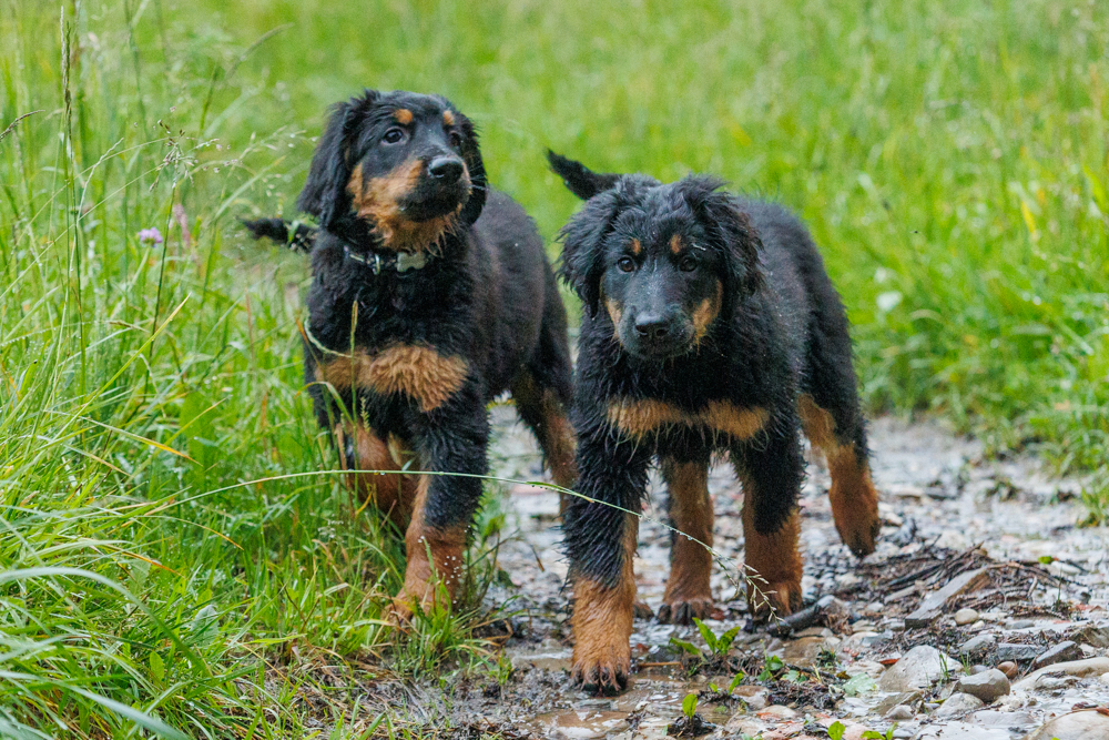 Leider spielt das Wetter nicht richtig mit und es regnet wie aus Kübeln und ist ziemlich kalt. Der geplante gemeinsame Besuch der Welpenschule fällt deshalb aus, aber jede kleine Regenpause wird genutzt, um gemeinsam draußen zu sein. Nur von der Mangfall halten wir uns entfernt, da diese bei dem vielen Regen viel zu viel Wasser mit sich führt und das Risiko, dass ein Welpe reinfällt, viel zu groß ist.