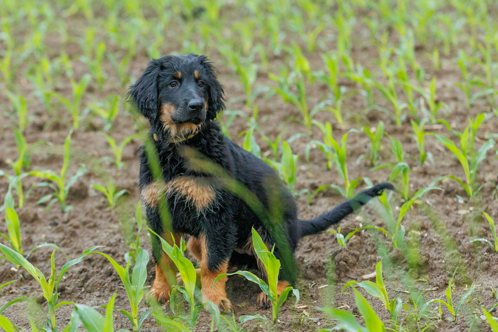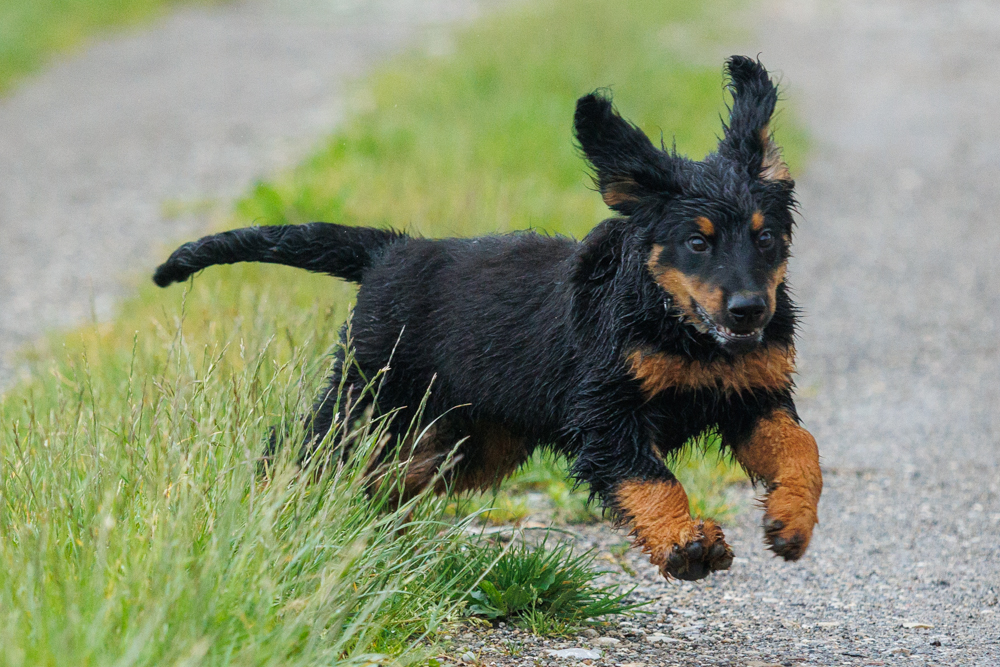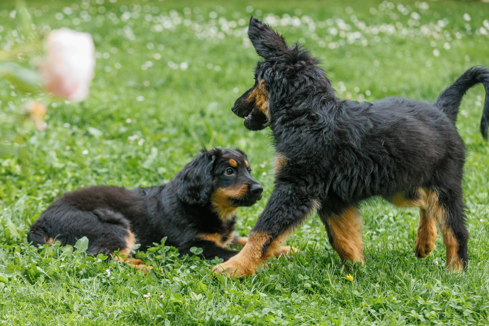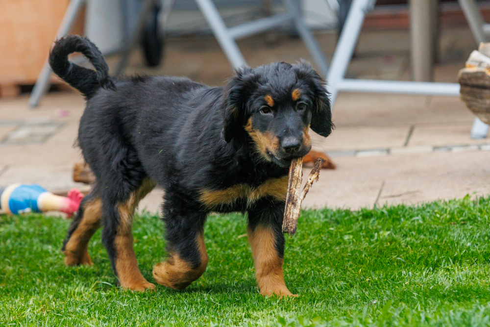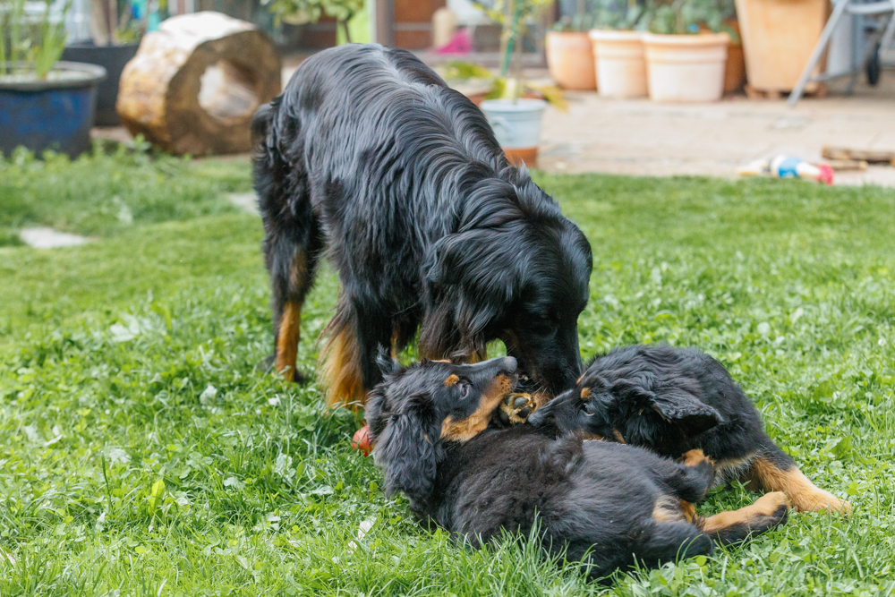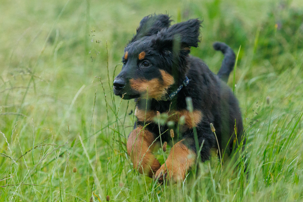 Leider spielt das Wetter nicht richtig mit und es regnet wie aus Kübeln und ist ziemlich kalt. Der geplante gemeinsame Besuch der Welpenschule fällt deshalb aus, aber jede kleine Regenpause wird genutzt, um gemeinsam draußen zu sein. Nur von der Mangfall halten wir uns entfernt, da diese bei dem vielen Regen viel zu viel Wasser mit sich führt und das Risiko, dass ein Welpe reinfällt, viel zu groß ist.