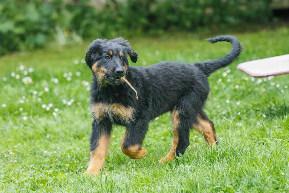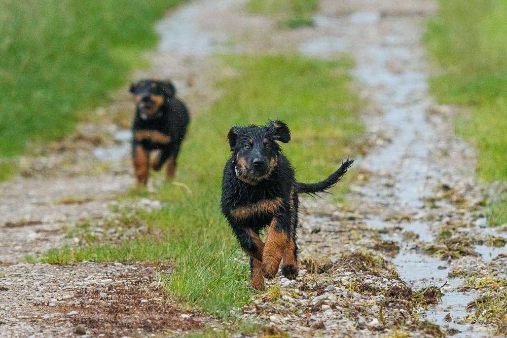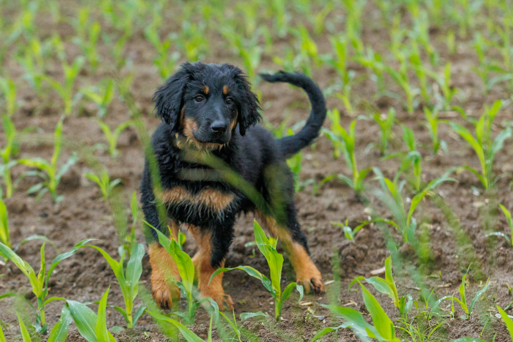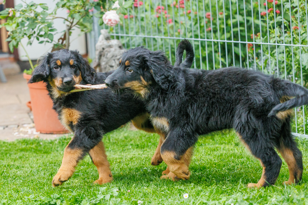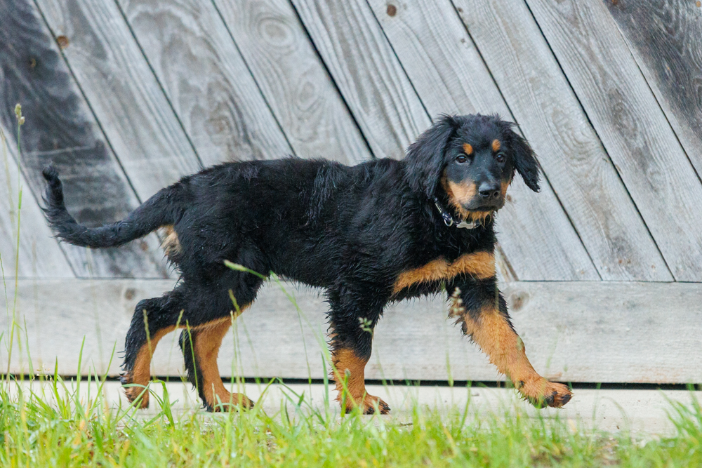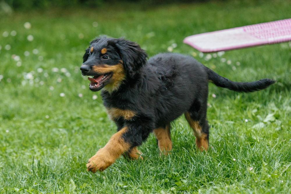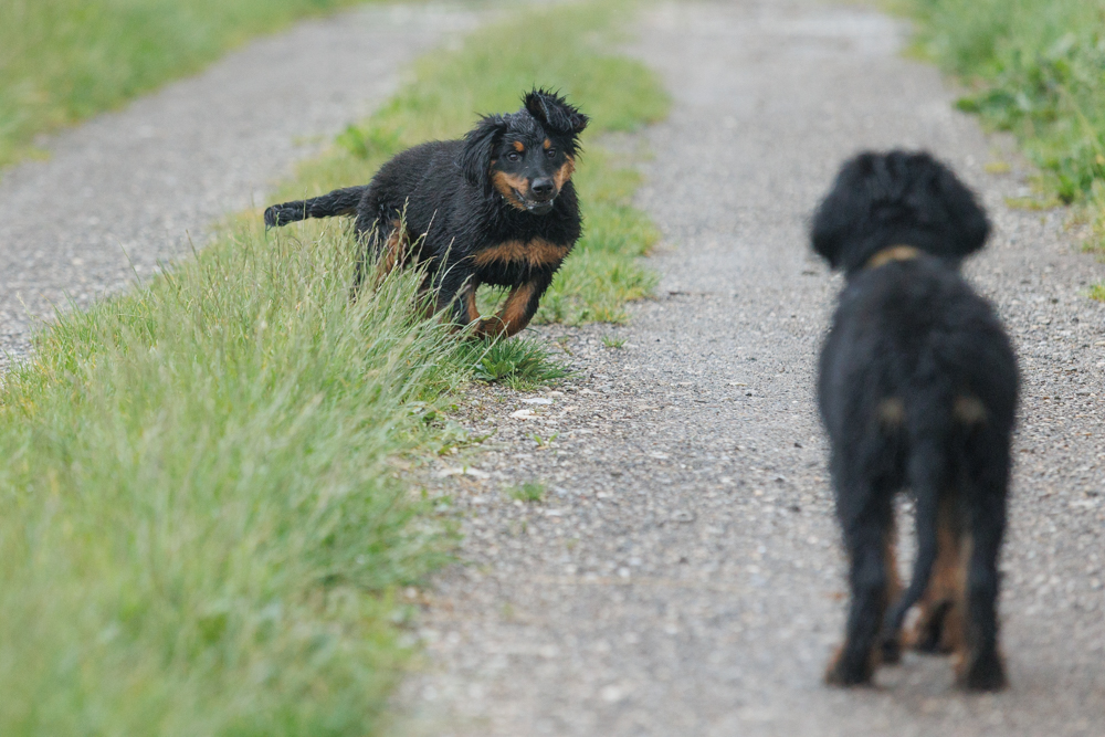 Leider spielt das Wetter nicht richtig mit und es regnet wie aus Kübeln und ist ziemlich kalt. Der geplante gemeinsame Besuch der Welpenschule fällt deshalb aus, aber jede kleine Regenpause wird genutzt, um gemeinsam draußen zu sein. Nur von der Mangfall halten wir uns entfernt, da diese bei dem vielen Regen viel zu viel Wasser mit sich führt und das Risiko, dass ein Welpe reinfällt, viel zu groß ist.