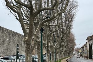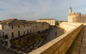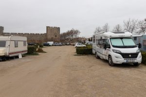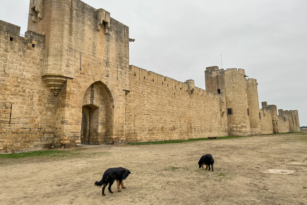Nach 43 km und einigen Umschweifen, weil eine Umleitung uns durch eine Unterführung mit 2,5 m Durchfahrtshöhe führen wollte, kommen wir um 14:50 Uhr auf dem großen Parkplatz und Womo-Stellplatz der Stadt an [N 43° 33′ 55,88“ E 004° 11′ 45,54“]. Es ist hochneblig bedeckt und hat 11 °C. Der Stellplatz liegt direkt vor der Festungsmauer, das bedeutet, dass man in kaum drei Minuten mitten in der historischen Altstadt ist.