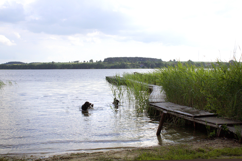 Wir fahren fürs erste auf derselben Route zurück, auf er wir gekommen sind. Um 14 Uhr machen wir zwischen Kaunas und Marijampolé (LIT) eine Rast und stärken uns für die Weiterreise. Das Wetter will sich nicht entscheiden, ob die Sonne oder der Regen die Oberhand bekommen soll. Bei Marijampolé pflügen wir dann durch jene Sintflut, die uns morgens schon schwante. Um 15 Uhr (14 Uhr MESZ) fallen wir wieder in Polen ein, gewinnen also eine Stunde. Weiter geht es über Suwałki nach Augustów. Hier biegen wir scharf nach Westen ab, auf der 16 nach Ełk (das frühere Lyck) – und befinden uns schon mitten in Masuren (nicht in den Masuren!). Selbst wenn man noch nie in dieser Gegend war, kommt sie einem irgendwie vertraut vor, vermutlich wegen der ostpreußischen Heimat- und Kriegsfilme, die ja mal Konjunktur hatten.