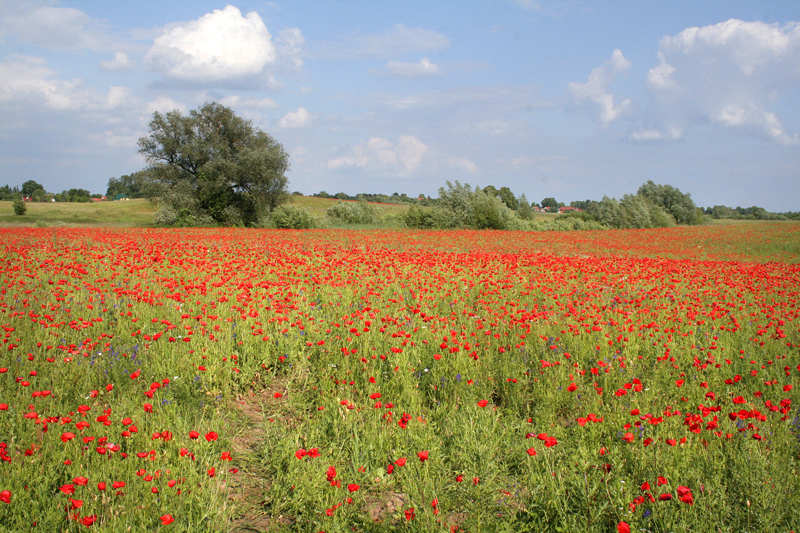 Der Verkehr nimmt ab, die Landstraßen sind endlose Eichenalleen, Störche gibt es hier noch mehr als in Lettland und auch noch größere dazu, und überall Seen, ganze Seenlandschaften, dazwischen grellrote Klatschmohnwiesen und –felder. Die Sonne, die hier endlich das Regiment übernommen hat, tut das ihre dazu, dieses Land in satten Farben an uns vorbeiziehen zu lassen. Hinter Ełk geht es auf der 16 weiter stramm nach Westen. Mit Mikołajki (Nikolaiken) lassen wir offenbar eines der Zentren des Masurentourismus‘ hinter uns, und bald darauf sind wir in Kosewo, einem kleinen Flecken am Probergsee (Probark) und stellen die Triebwerke auf dem Parkplatz des Country Holiday Hotels (N 53° 49‘ 43‘‘ E 21° 23‘ 15‘‘) ab, 17 Uhr Ortszeit. Laue Luft umweht uns, 20 ° C verwöhnen unsere Lettland-gestauchten Seelen, nur wenige Meter weiter plätschert der See leise gegen ein völlig menschenleeres Ufer. Raunt da jemand „So zärtlich war Suleyken“?
