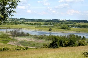 Immer weiter ziehen wir nach Norden, den See zu unserer Linken, im Schatten von Eichen- und Birkenalleen und vorbei an riesigen Holunderbäumen, die hier erst jetzt in voller Blüte stehen. Die Sonne legt sich kräftig ins Zeug. Über uns spannt sich ein kräftig weiß-blauer Masurenhimmel, der uns für das viele lettische Wasser mehr als reichlich entschädigt. In der Gegend des winzigen Weilers Śniadowo machen wir Rast und lassen die Mädels baden. Es ist warm geworden jetzt gegen Mittag, fast schon 25°C. Dann geht es weiter durch immer wieder wechselnde Landschaften, plötzlich frei werdende endlose Felder, bis wir die Nordspitze des Sees erreicht haben und nun an seiner Westseite den Rückweg Richtung Süden antreten. Hier führt der Weg meist in großzügigem Abstand am See entlang und im Gegensatz zur Ostseite mehren sich hier die Ferienhäuser und –anlagen. Zwar haben wir hier großartige Ausblicke auf die masurische Kulturlandschaft, aber die spirituelle Kraft des nahen Wassers fehlt irgendwie, und vielleicht liegt es ja auch daran, nicht nur, dass wir jetzt schon annähernd 20 Kilometer unter den Sohlen und Ballen haben, dass auch unsere Damen etwas zähflüssiger gehen.