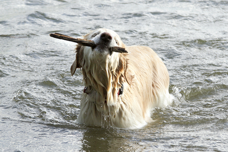 Die Hunde dürfen im Wasser tollen, solange sie wollen, es ist sowieso niemand da, den das stören würde und Zeit ist heute keine Kategorie mehr. Um 15 Uhr sind wir wieder im Hotel, machen es uns auf der Terrasse gemütlich und genehmigen uns Kaffee und Kuchen. Um 17 Uhr versinken wir dann noch einmal im Wasser des Probergsees und beschließen damit sozusagen rituell unsere Reise. Das alte Schlachtross Anouk ist auch jetzt wieder an vorderster Front dabei, gerade so, als ob es zuhause nur Wasser aus der Leitung gäbe.