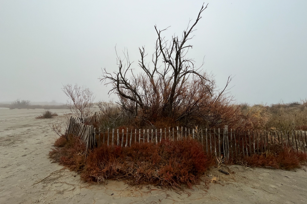 weil wir noch auf den Markt müssen, um uns für den Abend final zu versorgen. Normalerweise ist in Saintes-Maries der Markt montags und freitags auf dem Place des Gitans, der allerdings, wie wir wissen, noch vom Weihnachtsmarkt okkupiert ist, weshalb er derzeit in zwei Seitenstraßen ganz in der Nähe des Campingplatzes untergebracht ist, aber nur noch ein Viertel so groß mit mächtig reduziertem Angebot. Für uns reicht es allemal, ein bisschen Schinken, etwas Wurst, Käse, Gemüse, Datteln, eingelegte Oliven und Knoblauch, Baguette gibt es auch, also alles, was man fürs Leben braucht.