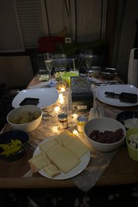 Kurz vor 18 Uhr, pünktlich während der Vorbereitungen zum Festmahl, ist der Strom weg, was etwas ungelegen kommt, wenn man vorhat, ein Raclette-Fest zu feiern (wie übrigens viele hier, was man an den im Supermarkt prominent angebotenen Raclette-Zutaten ablesen kann). Der Fön, der nach der Dusche auch zum Einsatz kommen will, hat ebenso Zwangspause wie das Heizöfelchen, das wir bei Stromanschluss nutzen, um Gas zu sparen. Nach einer halben Stunde ist dann wieder alles gut und dem Festmahl steht (hoffentlich!) nichts mehr im Weg.